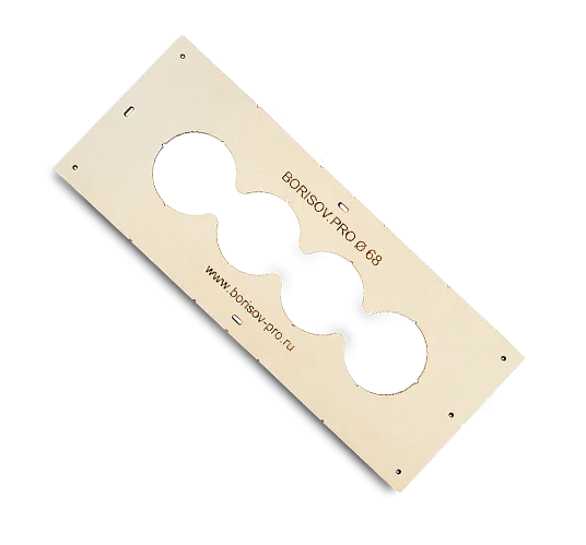 Шаблон с 4 отверстиями диаметром 68 миллиметров предназначается для точного сверления отверстий в самых разных поверхностях. Это могут быть стены из клееного бруса, керамической плитки, панелей, гипсокартонных листов, вагонки и т.д. Благодаря такому приспособлению отверстия получаются ровными и точными до 1 миллиметра. Производитель (компания Borisov Pro) изготавливает изделия из фанеры толщиной 6 мм, что гарантирует их высокое качество, а также стойкость к износу или долговечность.
