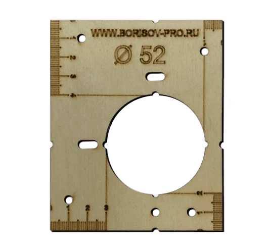 Шаблон со смещенным отверстием диаметром 52 мм предназначается для сверления отверстий в любых плоских поверхностях. Устройство используется для сверления отверстий в стенах из клееного бруса, керамической плитки, вагонки, гипсокартона, панелей и др. По конструкции шаблон представляет собой прочную рамку из фанеры (толщина 6 мм), а также одно отверстие диаметром 52 мм. Изделие отличается длительным эксплуатационным сроком (200-300 циклов использования).
