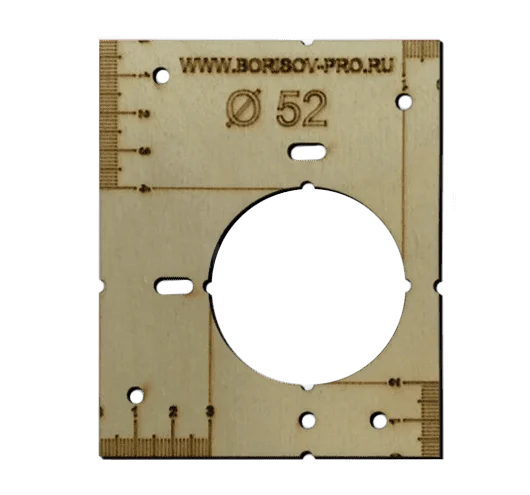 Шаблон со смещенным отверстием диаметром 52 мм предназначается для сверления отверстий в любых плоских поверхностях. Устройство используется для сверления отверстий в стенах из клееного бруса, керамической плитки, вагонки, гипсокартона, панелей и др. По конструкции шаблон представляет собой прочную рамку из фанеры (толщина 6 мм), а также одно отверстие диаметром 52 мм. Изделие отличается длительным эксплуатационным сроком (200-300 циклов использования).