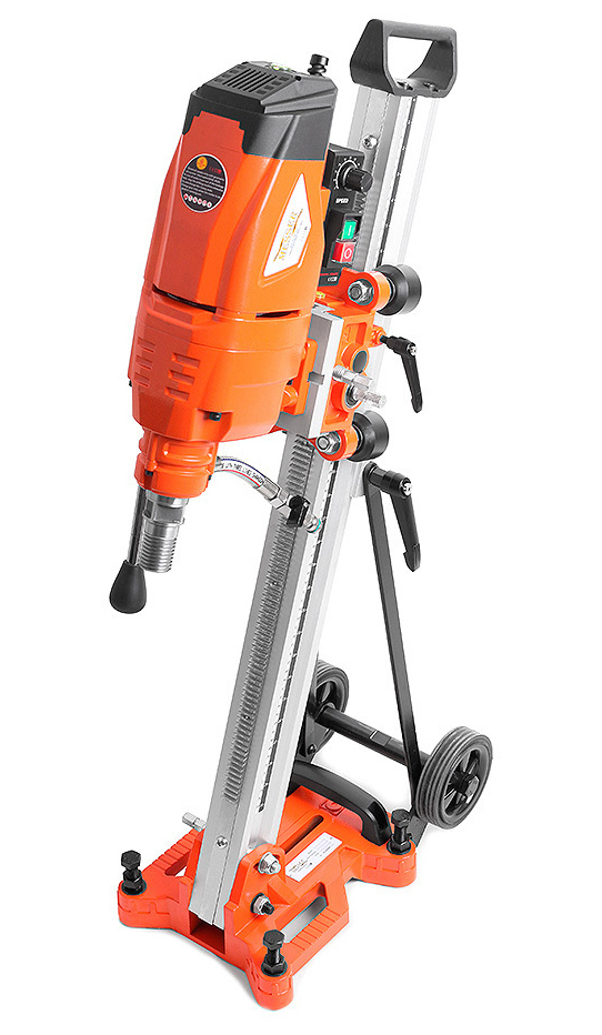 Установка алмазного бурения MESSER SA180-DM180 – оборудование для бурения отверстий в твердых поверхностях диаметром до 180 мм. Электродвигатель мощностью 3900 Вт оснащен системой плавной регулировки оборотов (100-620 об/мин). Двигатель монтируется на стойку при помощи быстросъемной пластины. В данной модели реализована система PRCD, защищающая оператора от поражения электротоком. Благодаря функциональной стойке возможно сверление под наклоном до 45 градусов.