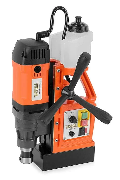 Магнитный сверлильный станок MESSER MDM-42 – мощный агрегат с компактными размерами для сверления отверстий диаметром до 42 мм, глубиной до 5.5 см. Станок предназначен для использования с кольцевыми сверлами типа HSS и TCT. Инструмент оснащен двигателем мощностью 1700 Вт, имеет вес 13 кг. Настройка оборотов двигателя – плавная (от 100 до 690 оборотов в минуту). Прочное крепление обеспечивается за счет магнитного сцепления с силой равной 15.6 тоннам. Станок отличается простой и понятной системой управления.