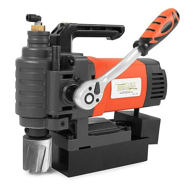 Магнитный сверлильный станок MESSER MDMG-35 горизонтального типа – устройство, предназначенное для сверления отверстий диаметром до 38 мм. Данная модель оснащается электродвигателем мощностью 1.65 кВт, отличается небольшими габаритами, за счет чего обеспечивается комфортная эксплуатации в ограниченном пространстве. Среди особенностей – быстросъемная рукоять (может устанавливаться с правой или с левой стороны корпуса), система подачи смазочно-охлаждающей жидкости с помпой, обеспечивающая защиту от перегрева.